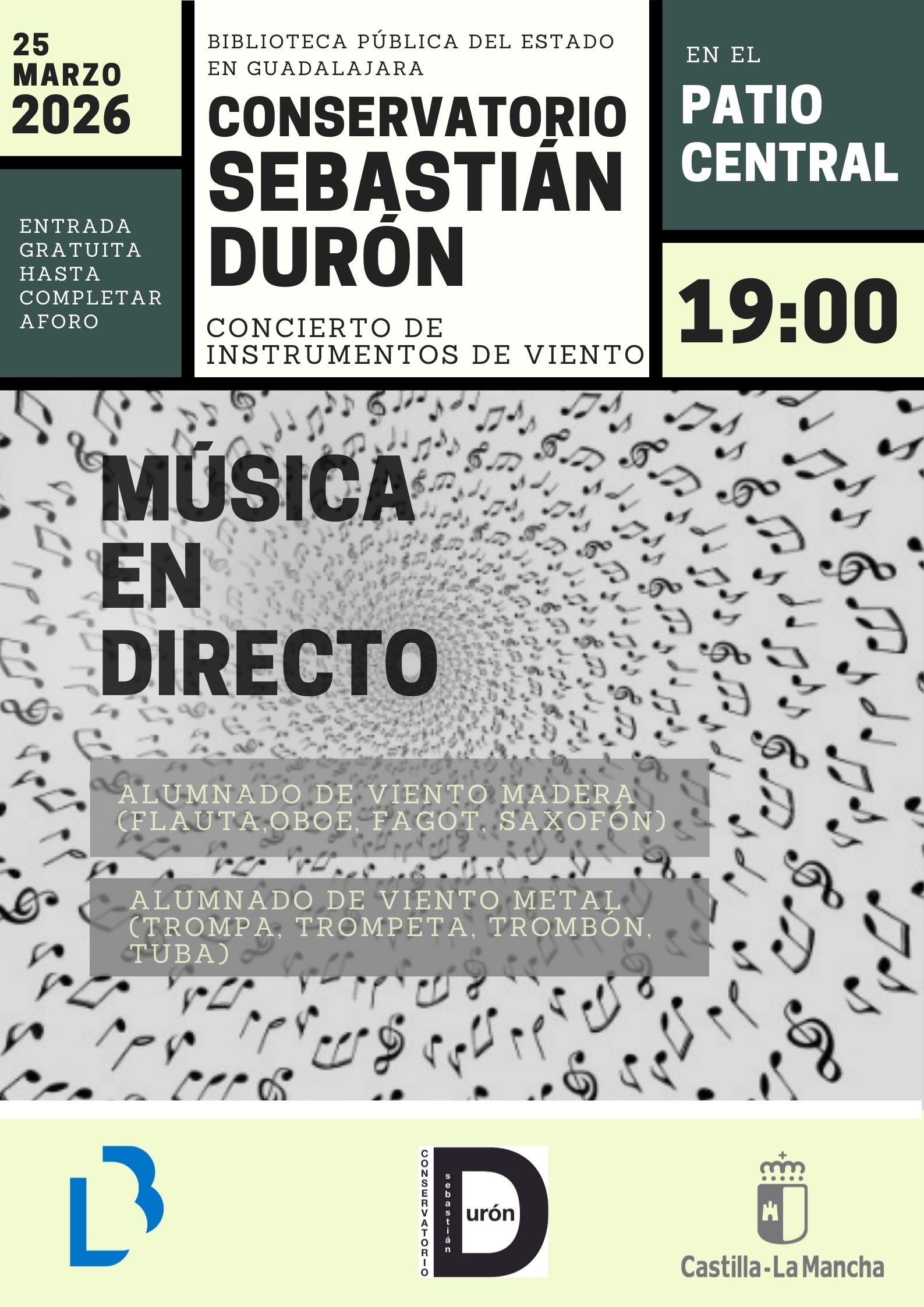 El alumnado de instrumentos de Viento Madera, Viento Metal y Percusión del Conservatorio "Sebastián Durón" de Guadalajara ofrecerán un concierto público, en el que participarán diferentes agrupaciones instrumentales.